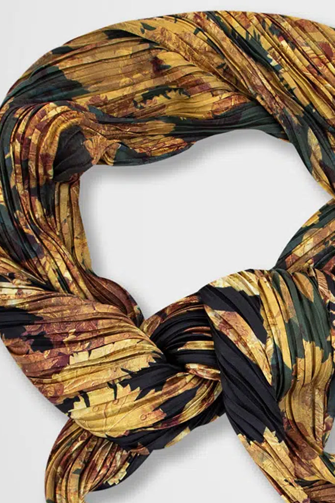 A very special scarf with impressive shades of black and gold by the internationally recognized Greek designer Alexandra Tsoukala . The Wreath scarf is made of synthetic silk with pleats and a special style. Its print is inspired by the golden wreaths with olive, myrtle, laurel or ivy leaves that have been found mainly in royal tombs in Macedonia and are exquisite examples of the goldsmith's art of the Hellenistic times.