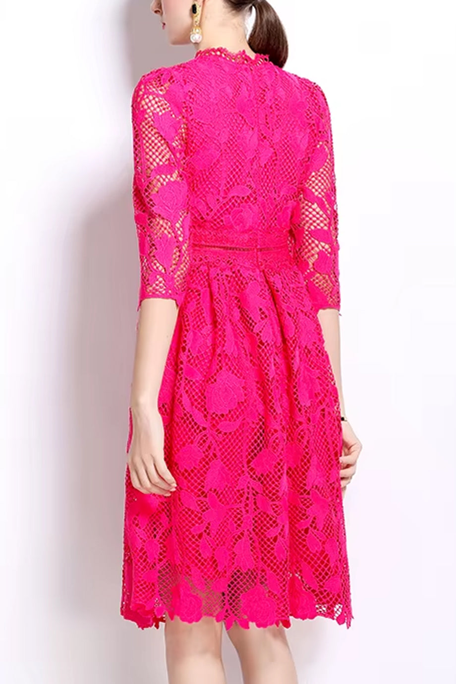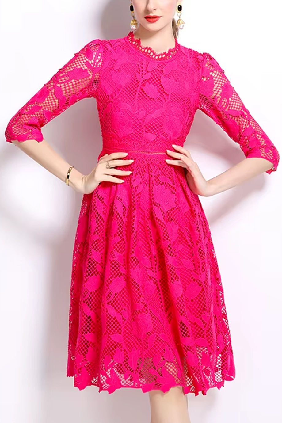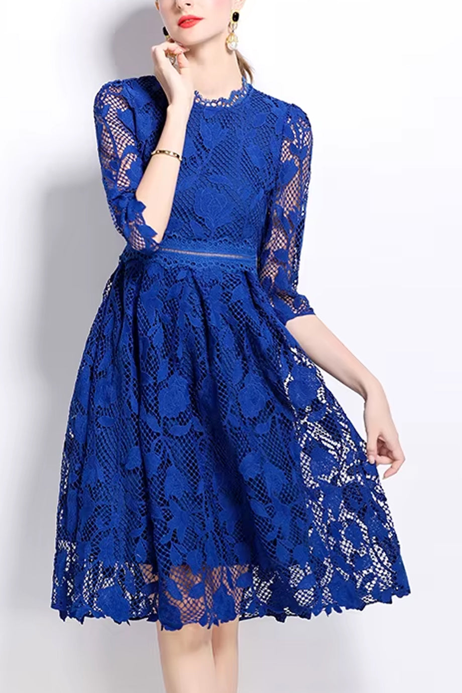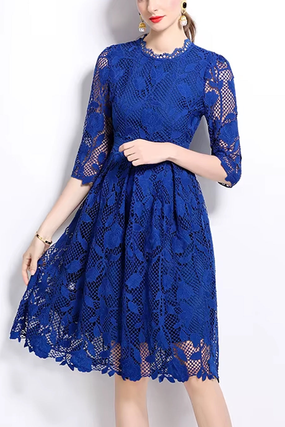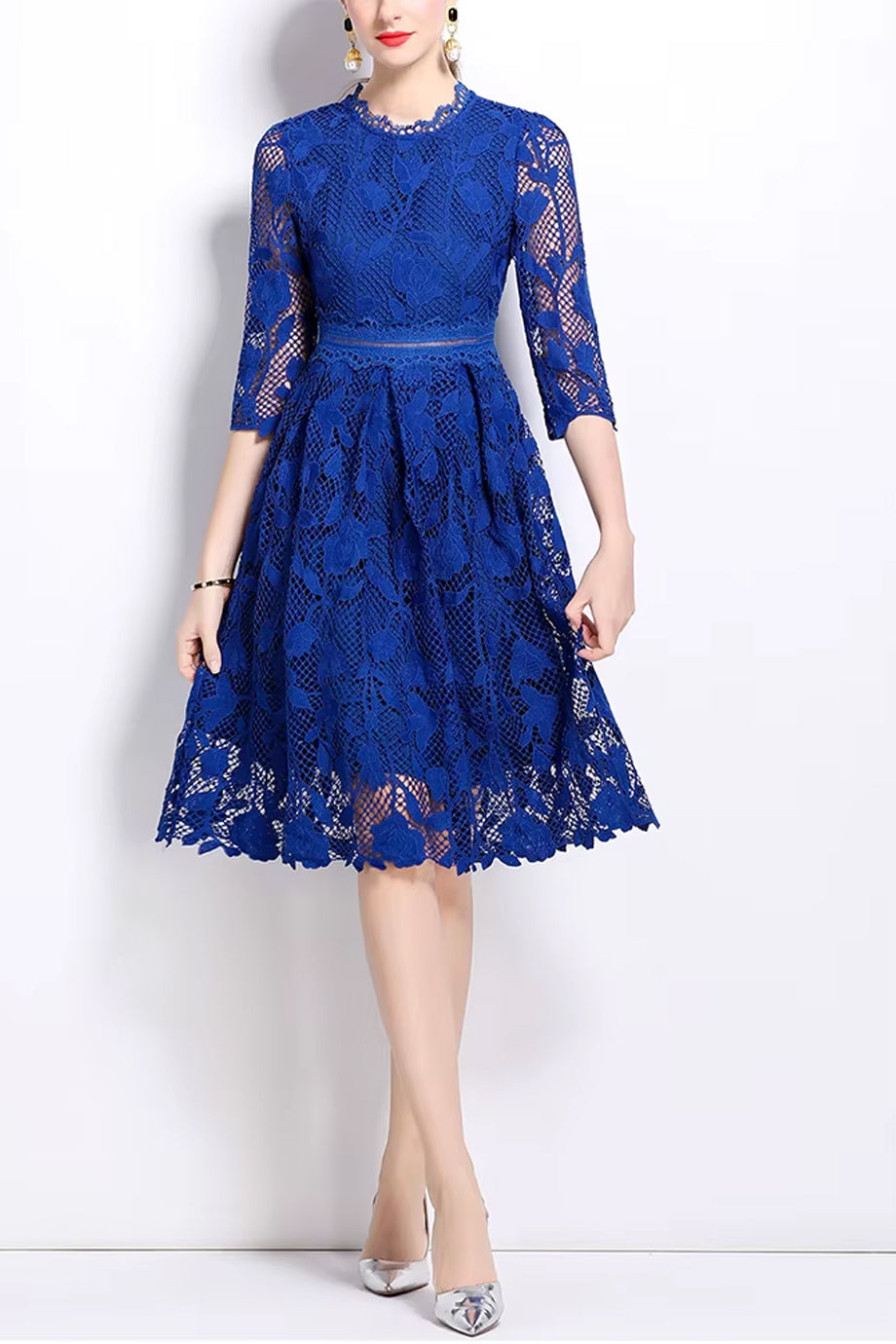 The Amily dress is elegant and feminine, in striking shades. It is made of lace with floral patterns. It features a round neckline and 3/4 sleeves made of translucent lace. The skirt is slightly airy and A-line. Please consult the size chart for correct size selection.