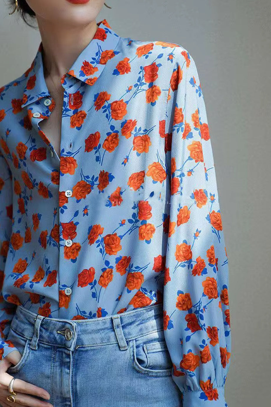 Bright, floral print shirt. The Blue Roses shirt features a print of red roses on a blue background. It has a classic collar and long sleeves. Please check the size chart below for the correct size selection.
