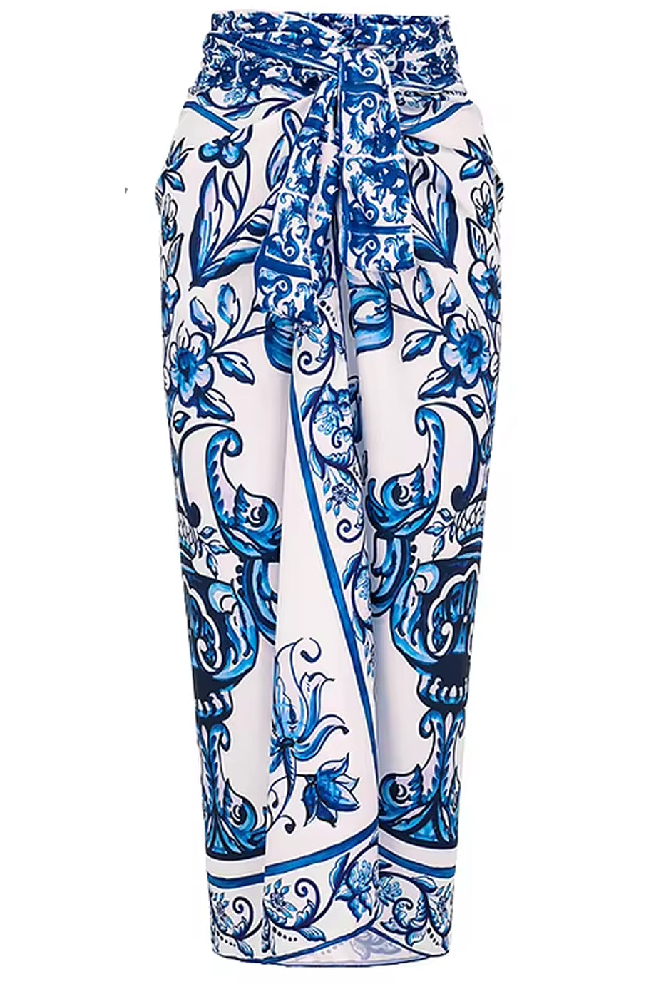 Set with one-piece swimsuit and pareo. The Elegant Waves swimsuit has an impressive design with a V-neck and wide straps. One shoulder is decorated with a ruffle. It is printed with geometric flowers and patterns. The set has a pareo that fits with a tie. Consult the size chart below for the correct size selection.