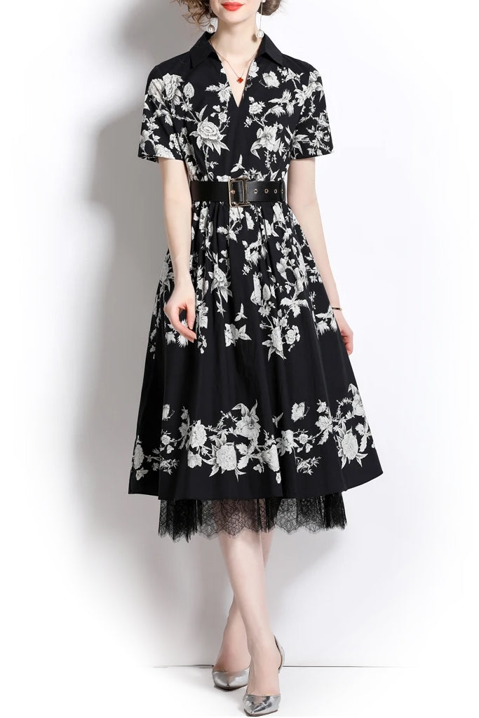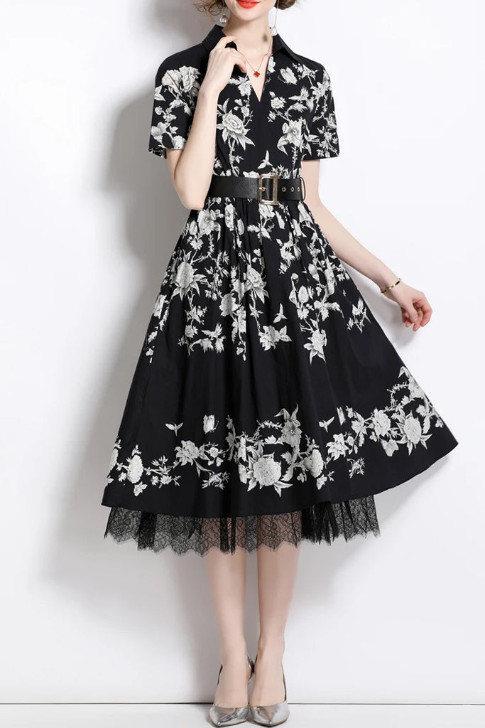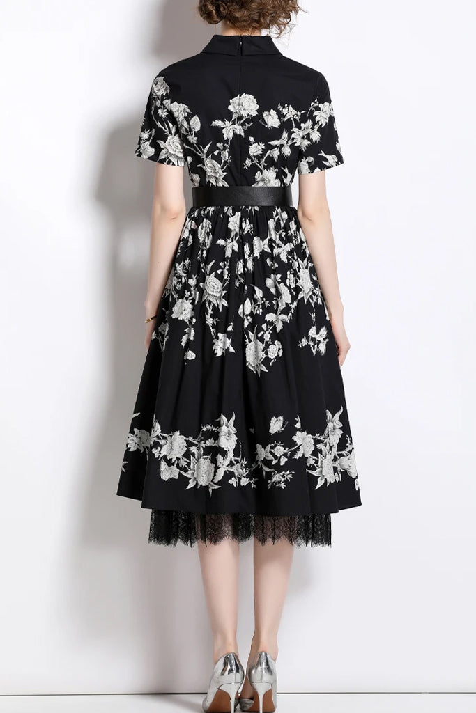 La robe Navaly d'Elodie présente des fleurs blanches sur fond noir. La robe a un décolleté en V, des manches courtes et une jupe volumineuse ornée de dentelle noire. Ajoutez une paire de talons hauts et du rouge à lèvres pour le look ultime. Consultez le guide des tailles ci-dessous.