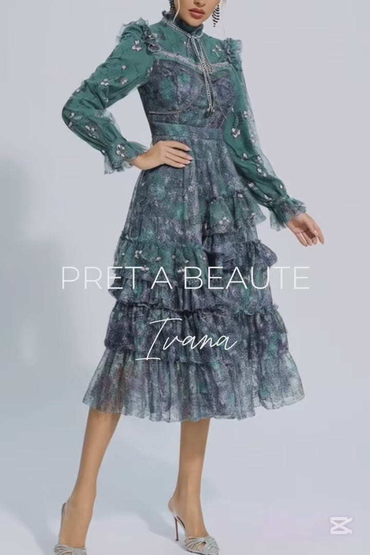 Une robe incontournable pour toute occasion élégante. Offrez-vous le luxe avec la robe Ivana, dotée d'un délicat tulle d'organza et ornée de broderies florales complexes. Le design en maille et les manches longues ajoutent de l'élégance et de la sophistication, parfaits pour toute occasion spéciale. La couleur pétrole unique ajoute une touche d'exclusivité à cette pièce tendance.