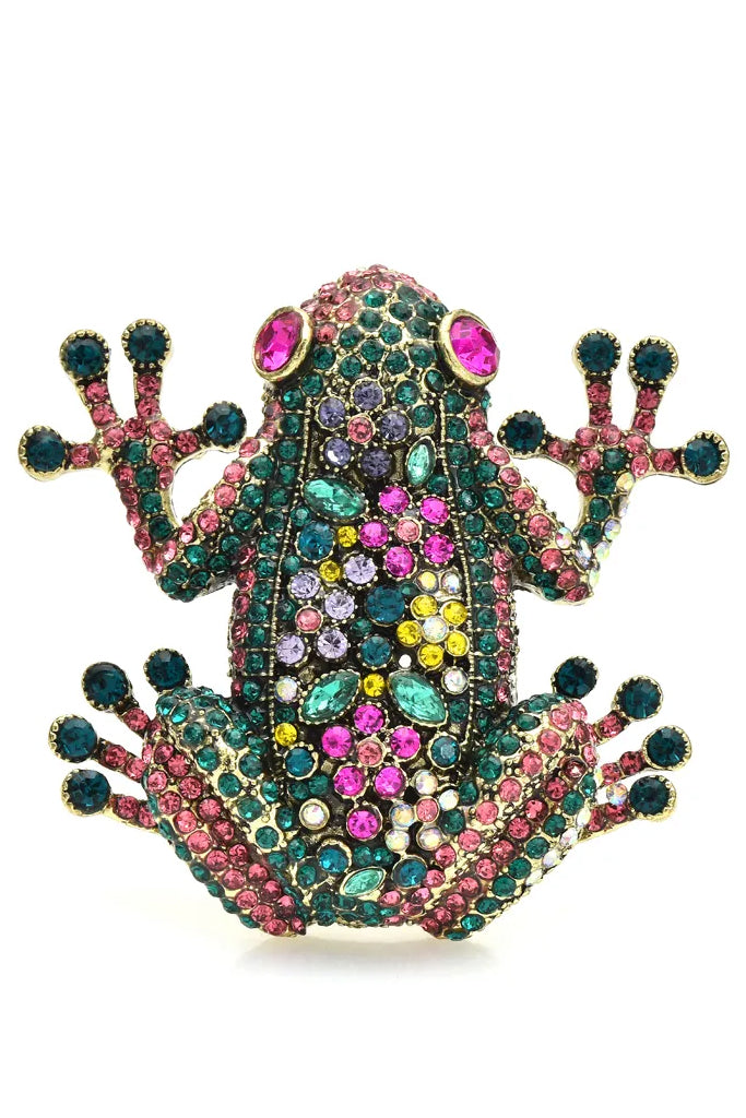 Broche grenouille avec cristaux verts, turquoise, fuchsia, roses et clairs. Portez-le sur votre revers ou sur votre corsage et transformez même votre tenue la plus simple.