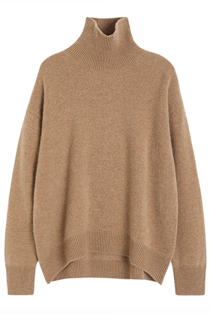 Oversized, asymmetric sweater from Moncye. The Layla sweater has a turtleneck. It's soft and warm.