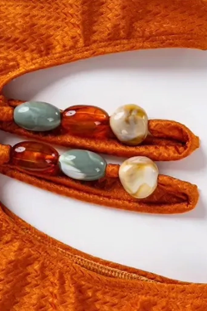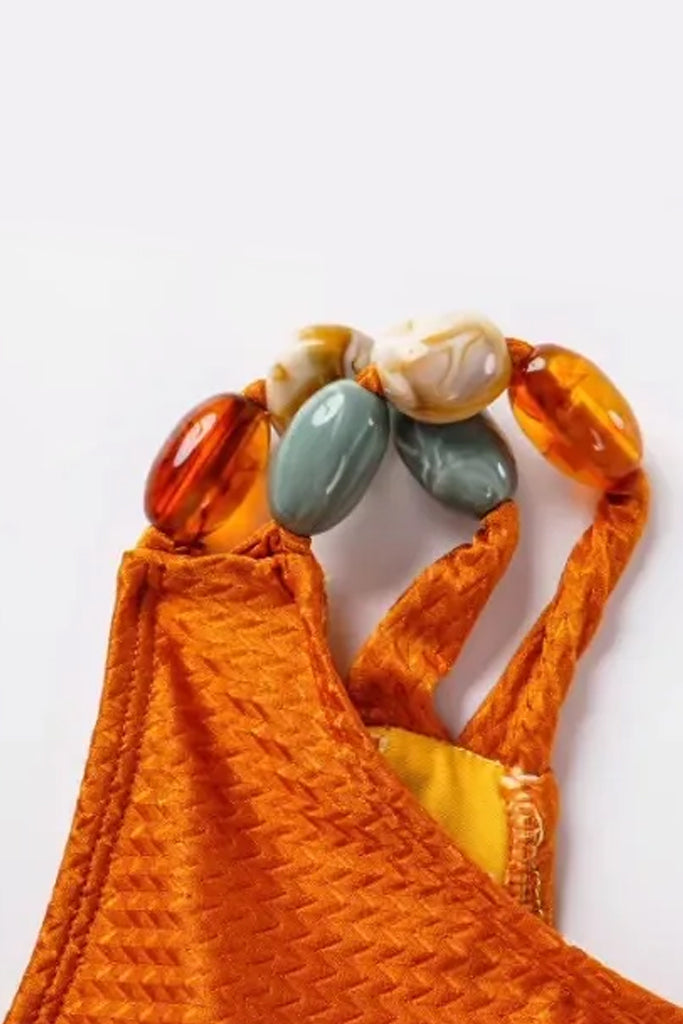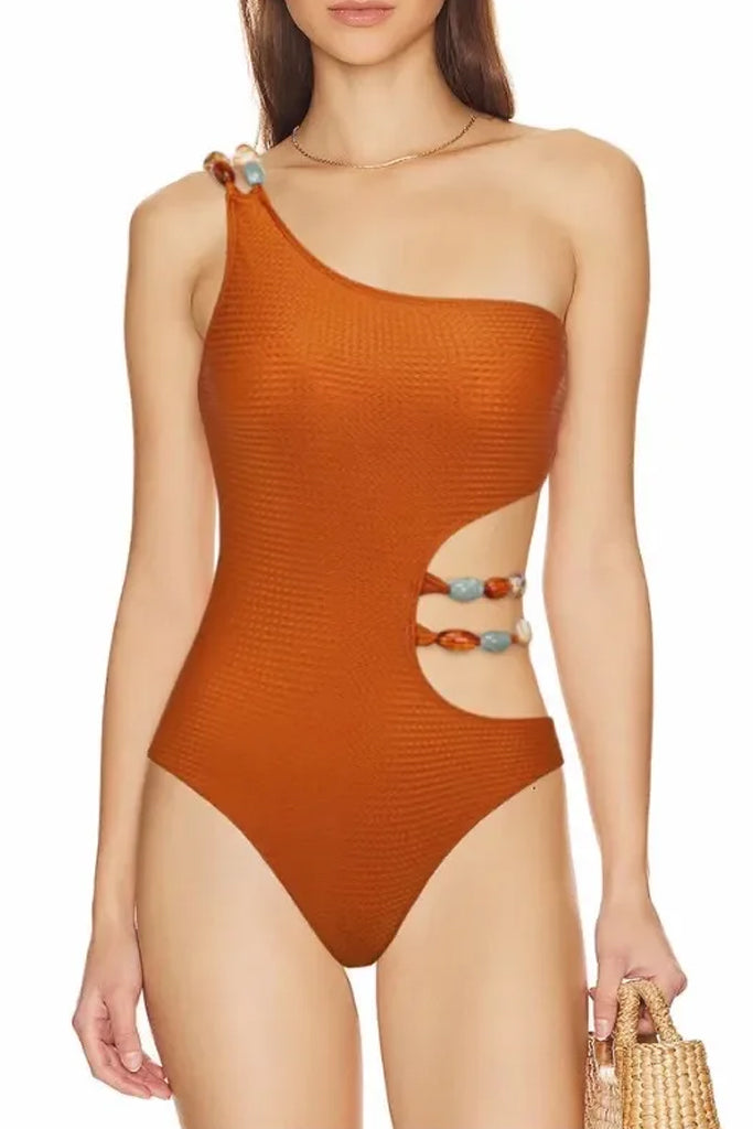 One-piece swimsuit and pareo set in earth tones of camel, orange, green and brown. The Tarliana swimsuit has an impressive design with cutouts. It has reinforcement at the bust. The pareo has transparency.