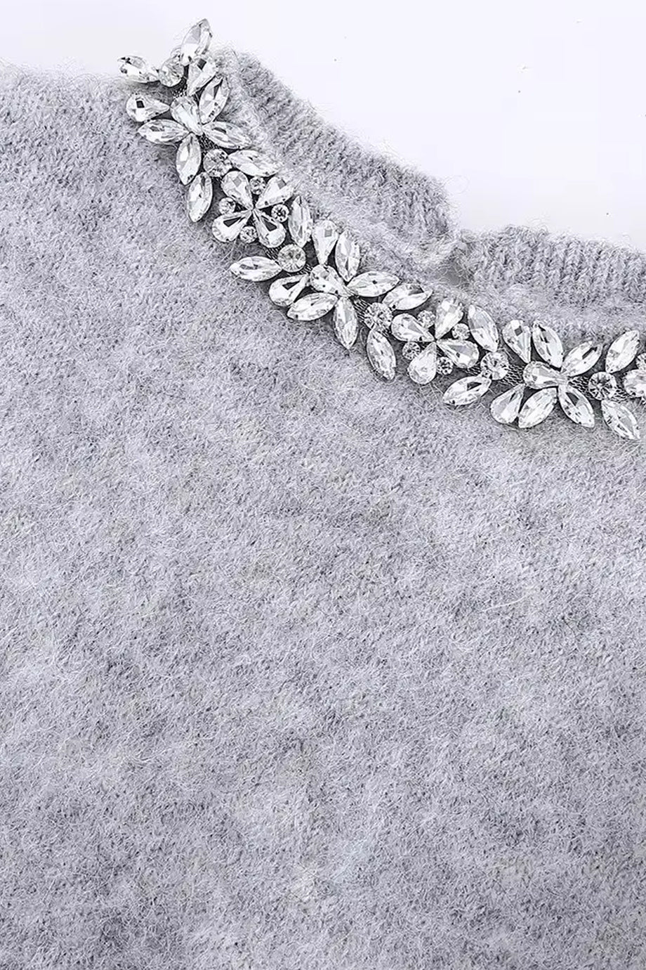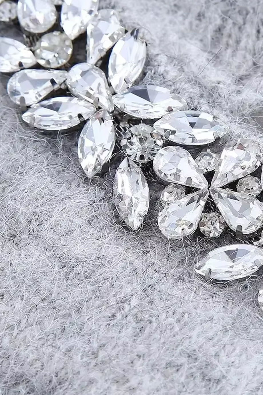 The Venur sweater has gray color and a round neckline decorated with impressive crystals. It features 3/4 sleeves and decorative pockets. Soft and warm. Match it with a grey satin skirt and high heels for an impressive evening look. One Size. Please consult the size chart below.
