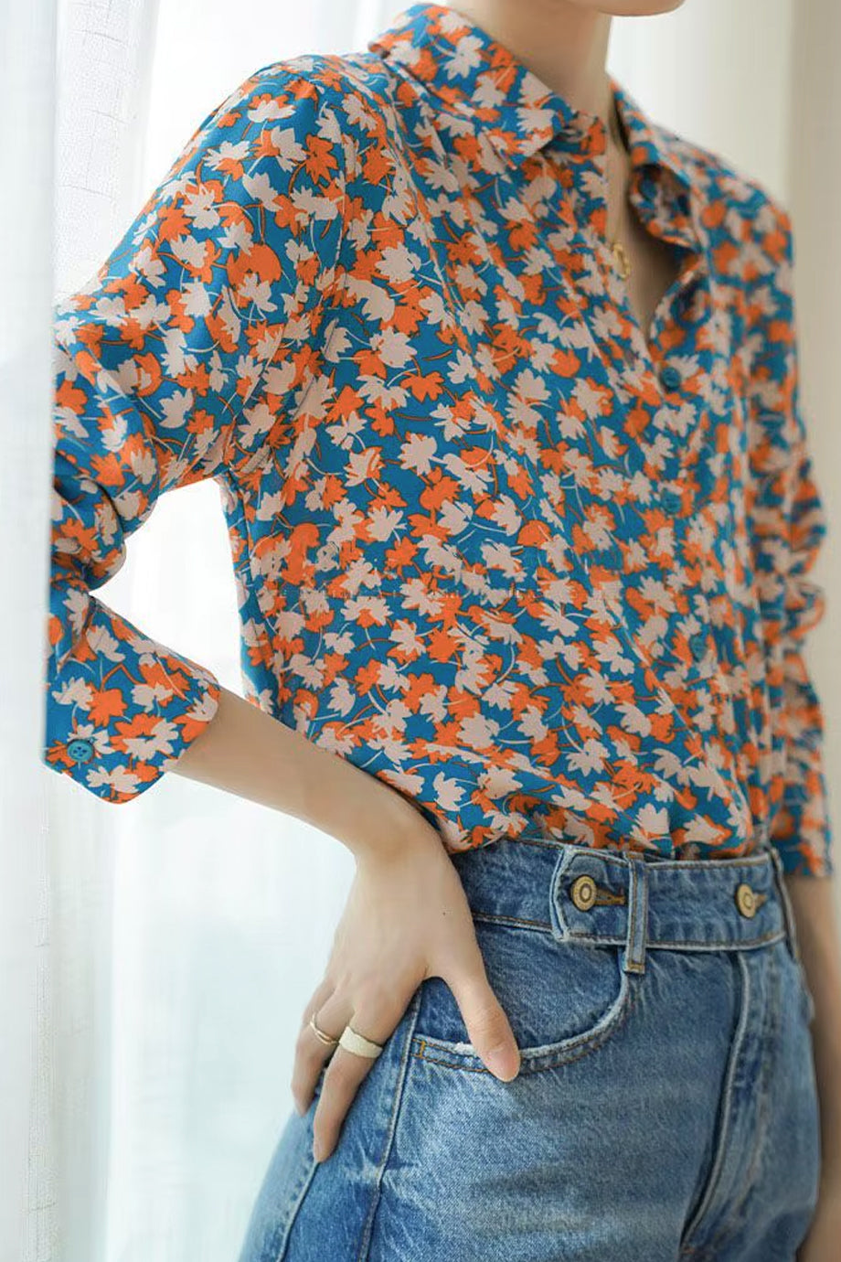 Elegant printed shirt by Laura Ferri. The Ambertina shirt consists of flowers with a unique design in bright colors. It has a classic collar and long sleeves. Please check the size chart below for the correct size selection.