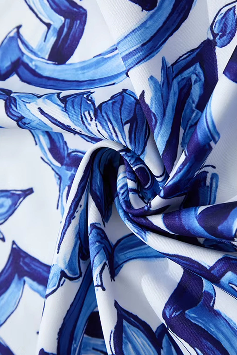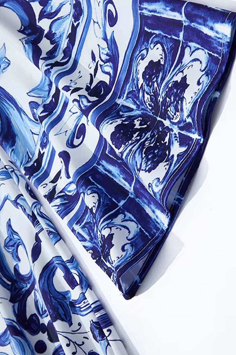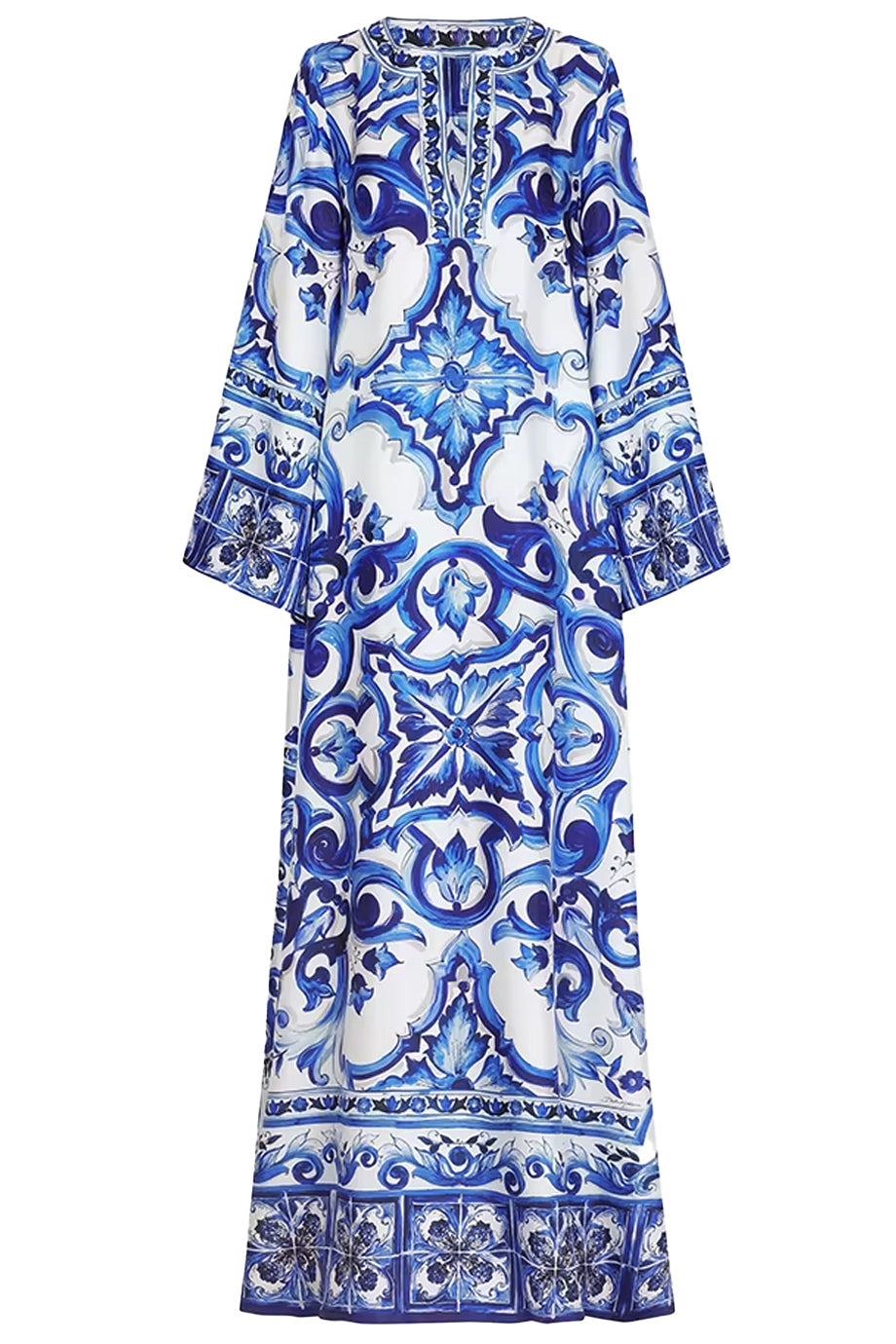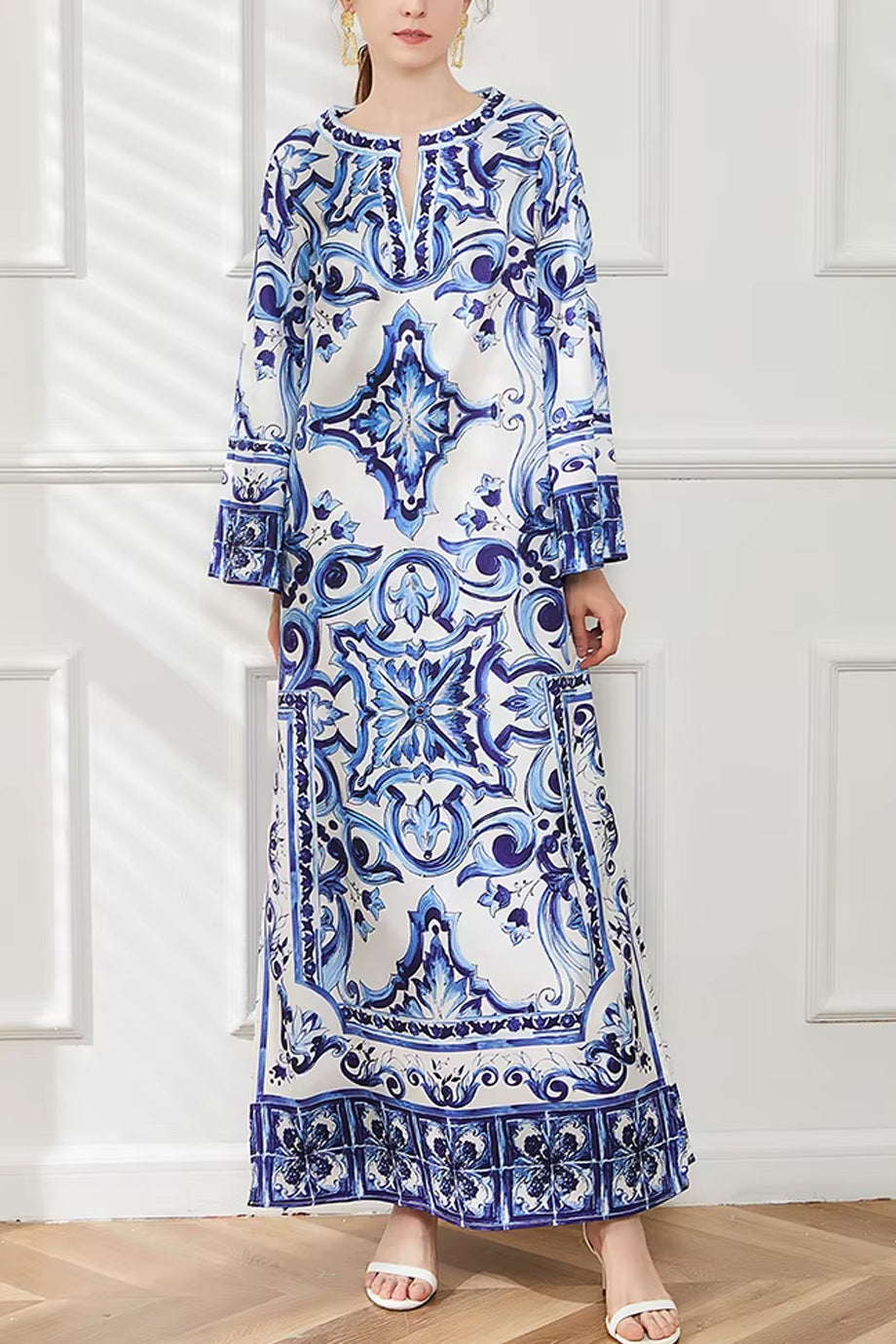 Step into a world of timeless Mediterranean elegance with the Azure Reverie Maxi Dress. Crafted from lightweight, silky polyester, this dress features a mesmerizing mosaic-inspired print in vivid shades of blue and white. The flowing maxi silhouette, relaxed long sleeves, and intricate neckline detailing evoke effortless sophistication, perfect for seaside escapes or upscale summer events. Let its vibrant energy transport you to sun-drenched shores and moonlit promenades.