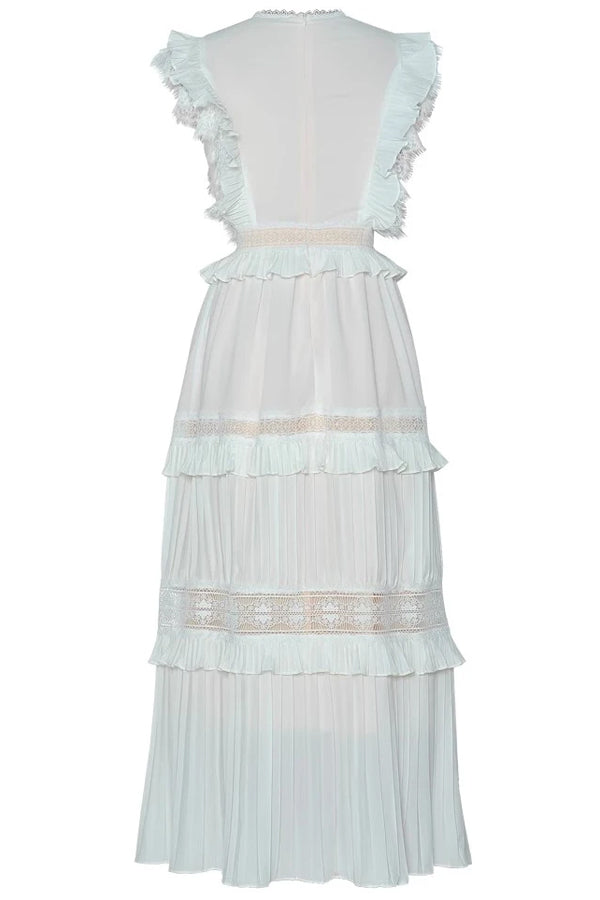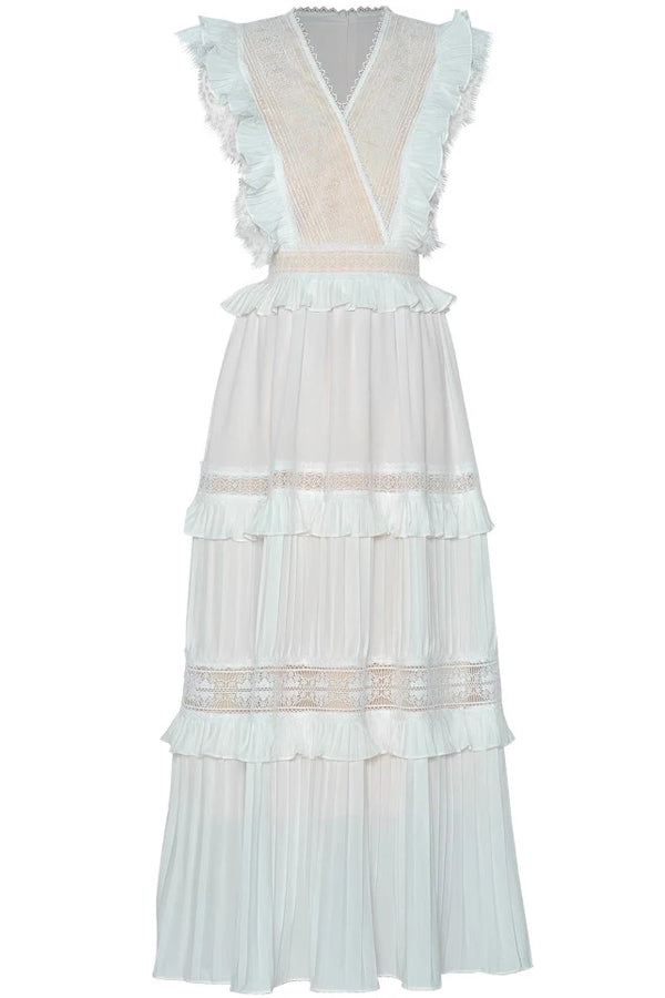 A A dress that feels like a whispered tale under the stars. Delicate lace panels, romantic ruffles, and flowing pleats come together in a symphony of elegance and poise. The V-neckline is adorned with ornate lacework, while the tiered skirt sways gracefully with each movement. A timeless statement piece destined for moonlit evenings and graceful entrances.
