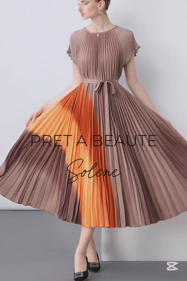 The Solene dress stands out for its playful yet elegant design. It features sharp pleats, a waist-defining belt, and a midi length that adds movement and femininity. Its multicolor effect creates a dynamic yet balanced look.