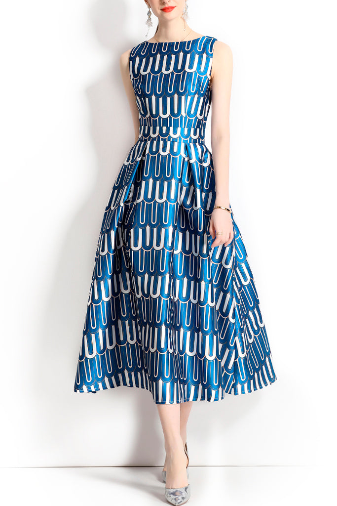 Impressive dress. The Nevaeh dress is blue with geometric prints on a shiny brocade-like fabric. It has a smile-like neckline and is sleeveless. Wear it and impress at all your events. Consult the size chart below for the correct size selection.