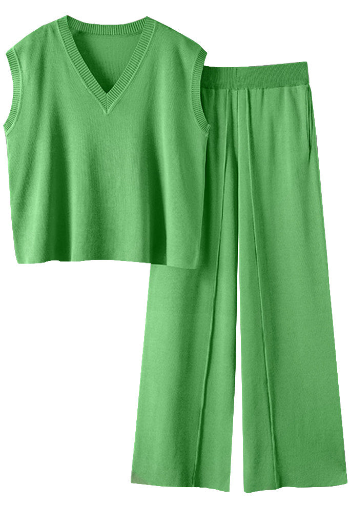 Knitted set for you who want to feel comfortable at all hours of the day. The Drew set by Moncye consists of a knitted sleeveless V-neck top and long trousers with a ribbed knit and elasticated waist. One Size. Consult the size chart below.