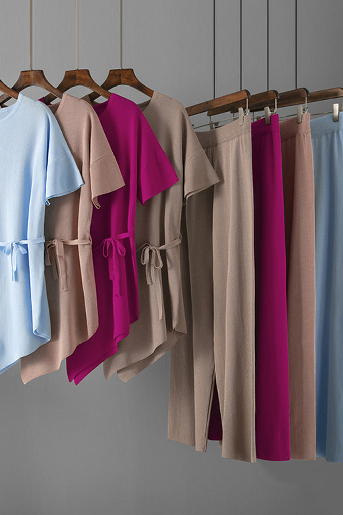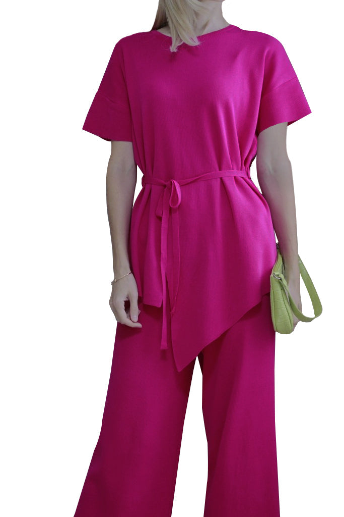 Knitted, impressive set for all hours of the day. The Kenna set by Moncye consists of a knitted asymmetric top with a smiley neckline and short sleeves, as well as long trousers with a ribbed knit and elasticated waist. One Size. Consult the size chart below.