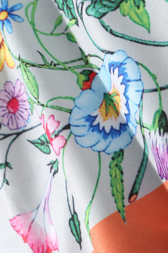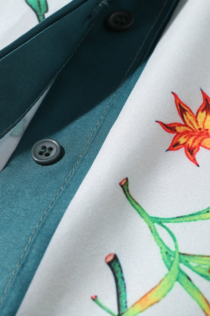 The Floral Park shirt features a striking floral pattern alternating with minimal prints on the sleeves. It has long sleeves and a button-down fit. Please refer to the size chart below for the correct size selection.