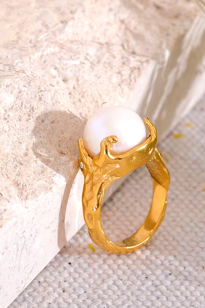 Particularly impressive ring. The Jasie ring is gold plated, with three layers of gold plating. It bears an impressive pearl and elegantly hugs the finger. It is made of steel.