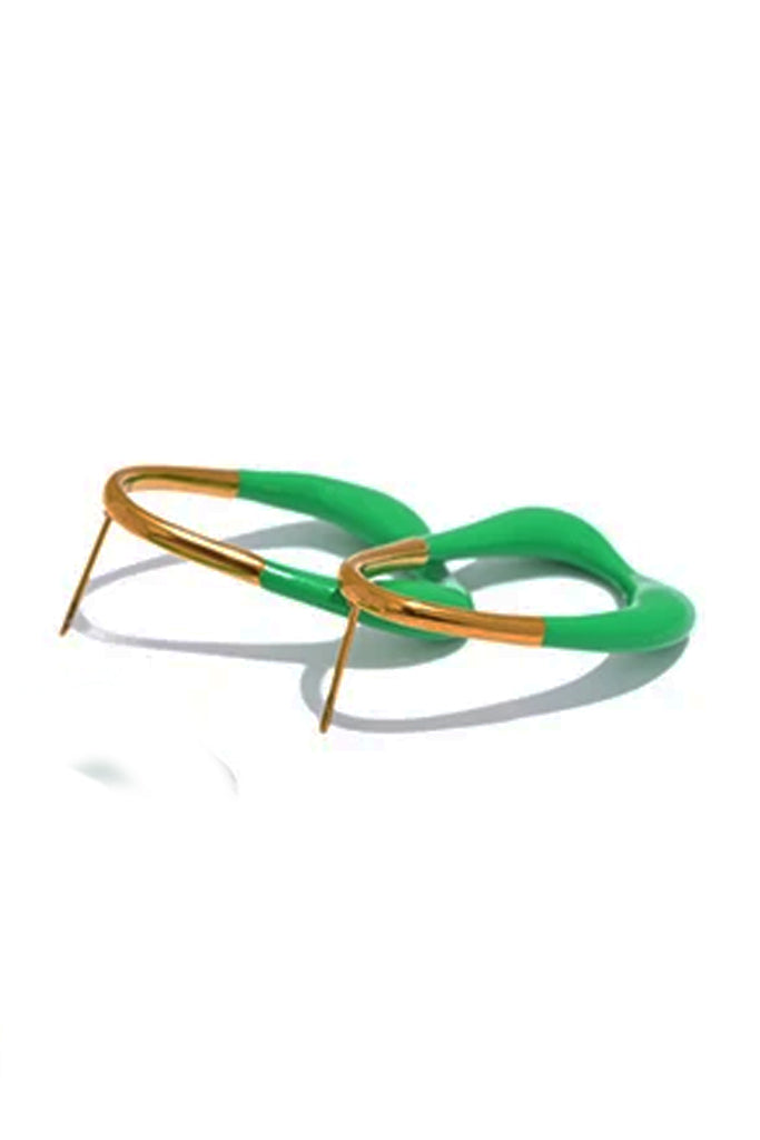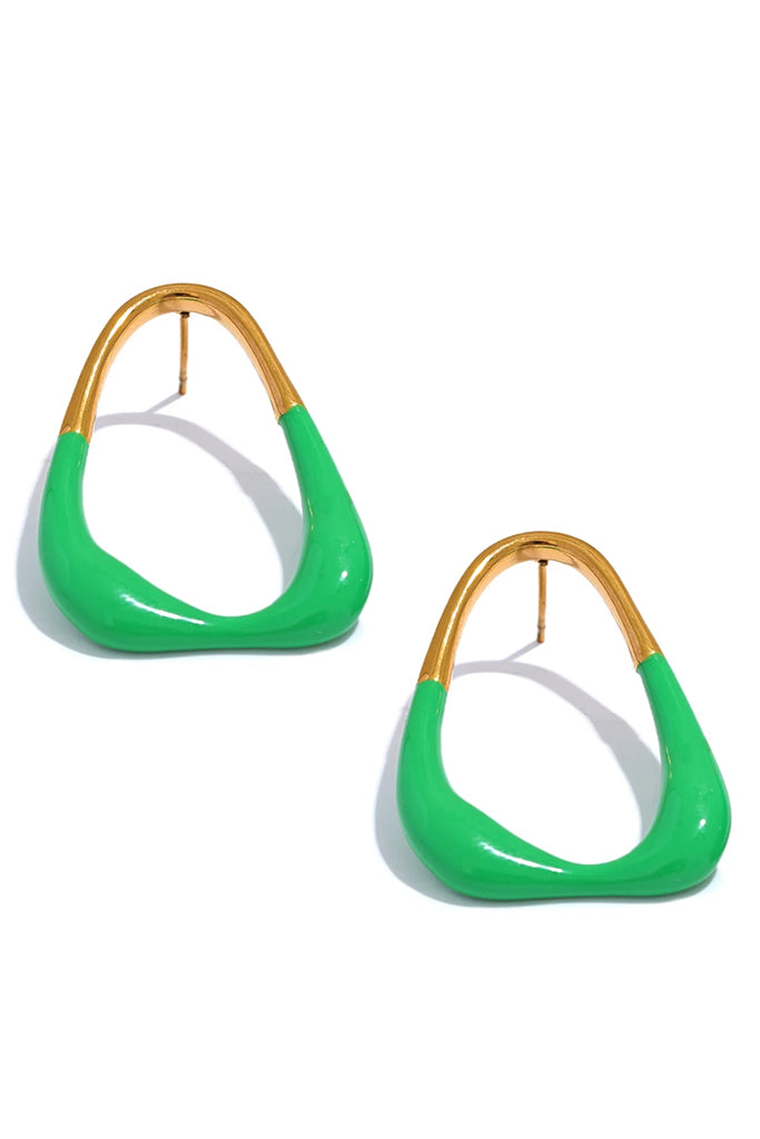 Earrings in a geometric shape with green enamel coating. Dama earrings fit with a butterfly clasp and are for pierced ears only.