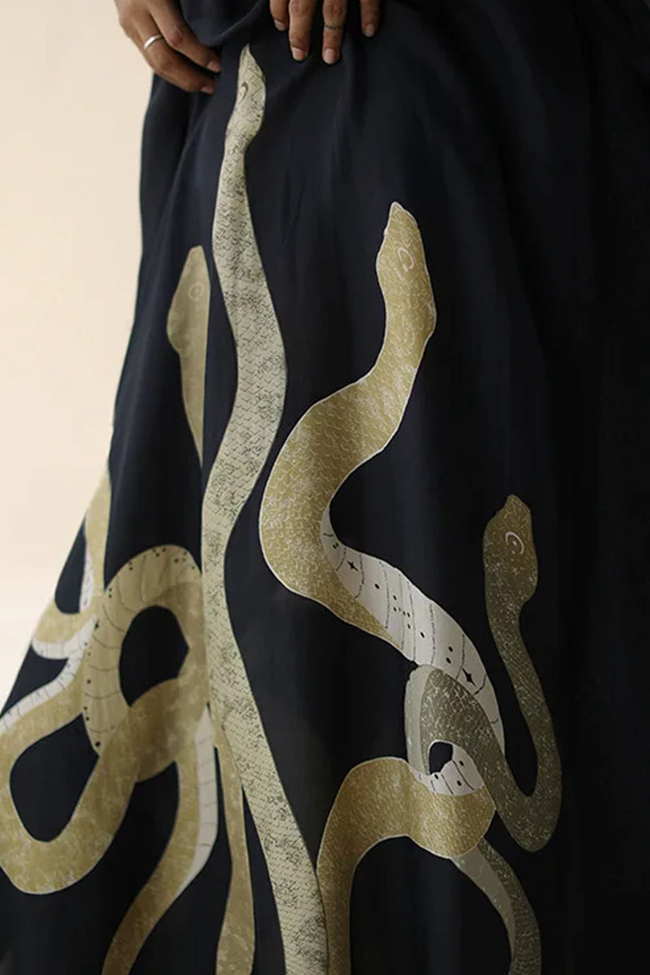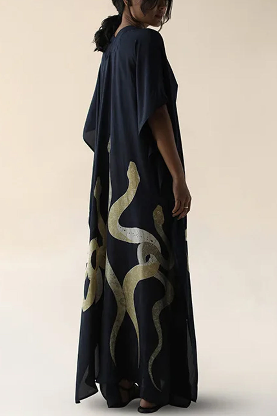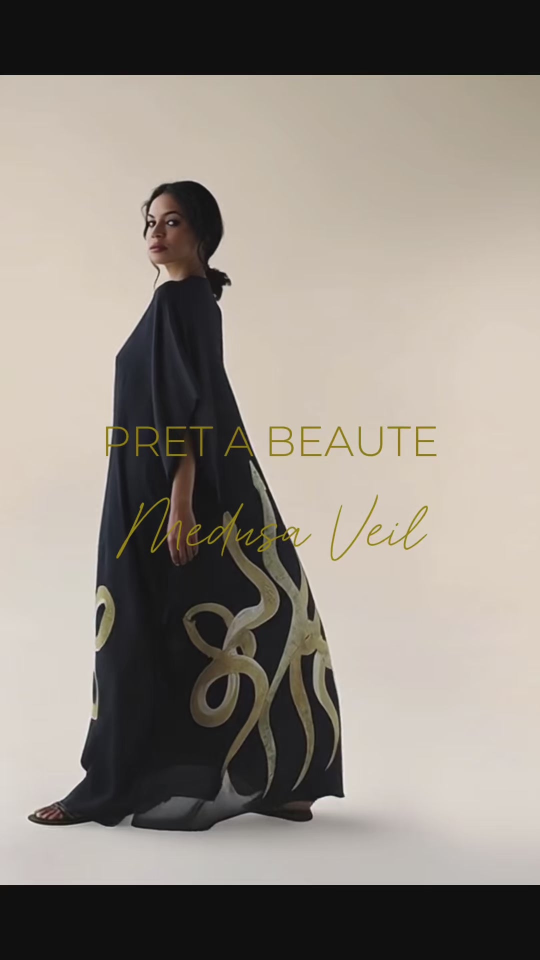 Wrap yourselves in the mythical allure of Medusa Veil, a kaftan where flowing elegance meets fierce symbolism. The deep black fabric moves with ethereal grace, while golden serpents slither across the hem, channeling power, transformation, and feminine mystique. Ideal for beach strolls, resort lounging, and commanding entrances.