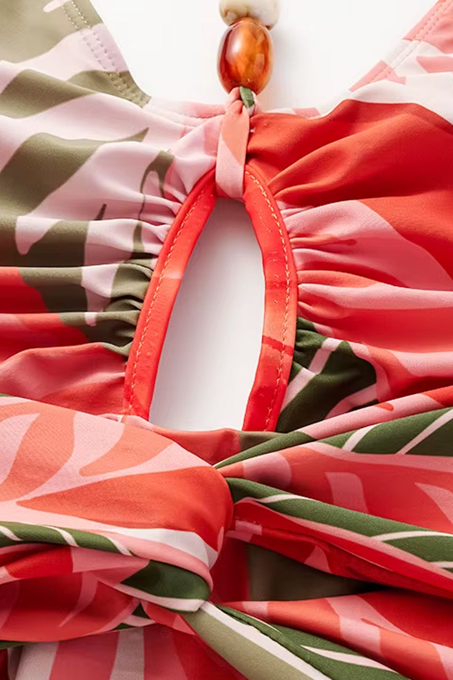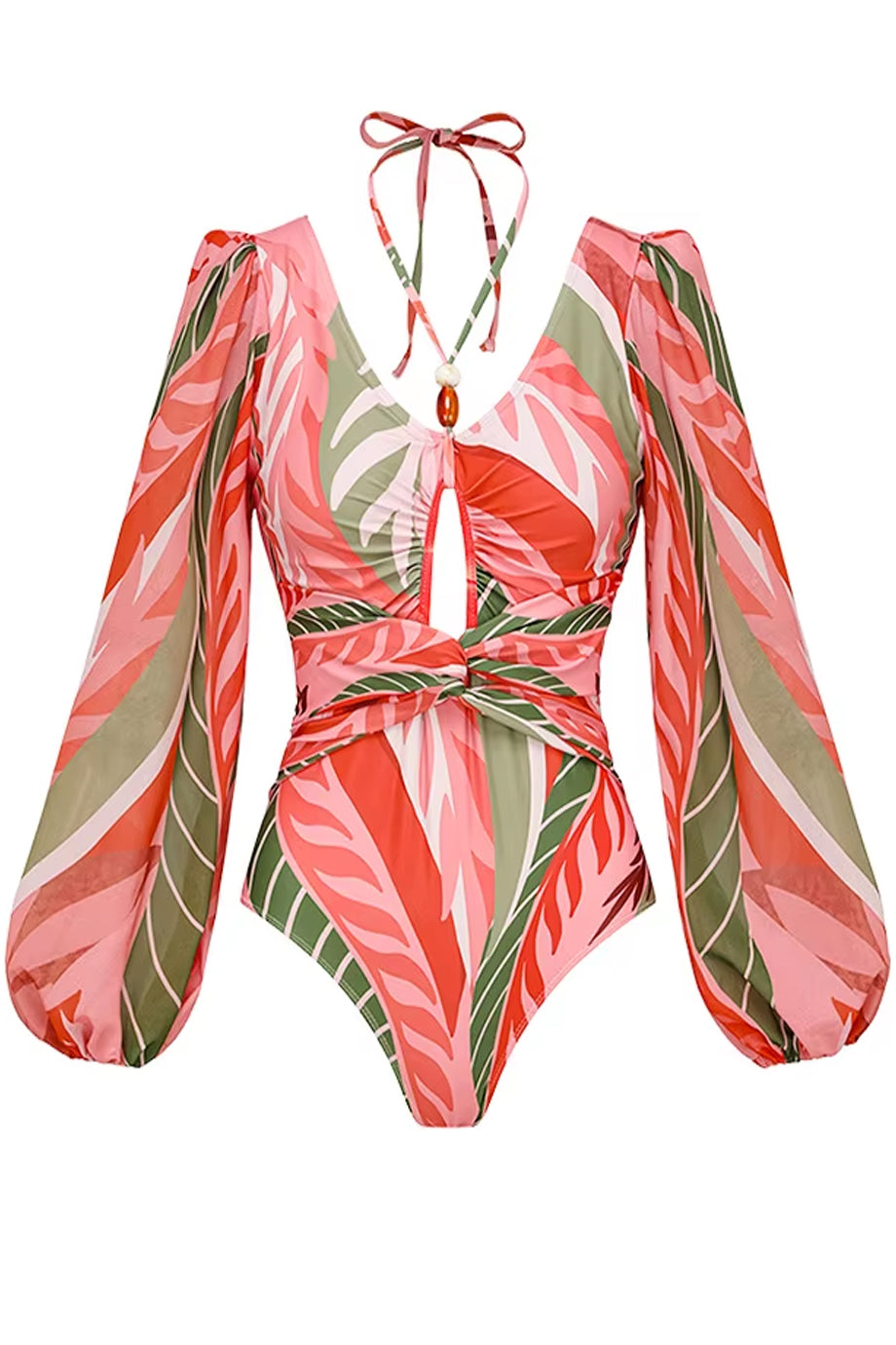 Step into summer with the Penelope set – a strikingly feminine one-piece swimsuit paired with a matching pareo skirt. Featuring an exclusive tropical leaf print in vibrant coral, blush pink, olive, and red tones, this set captures the essence of sun-drenched getaways. The swimsuit offers a flattering plunge neckline, long transparent sleeves, and a keyhole cut-out , tied at the neck with a delicate string. Designed for elegance and comfort, it’s fully lined and crafted from quick-drying, high-quality stretch fabric. The layered pareo skirt adds effortless glamour – perfect for transitioning from beach to beach bar in seconds. Consult the size chart below for the correct size selection.