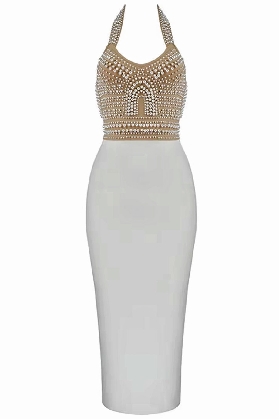 Show off your feminine side with the stunning Melany dress. It features a unique bodice decorated with sparkling pearls, while the halter-neck highlights the shoulders and neck, adding a modern touch. It has a fitted line that hugs the silhouette.