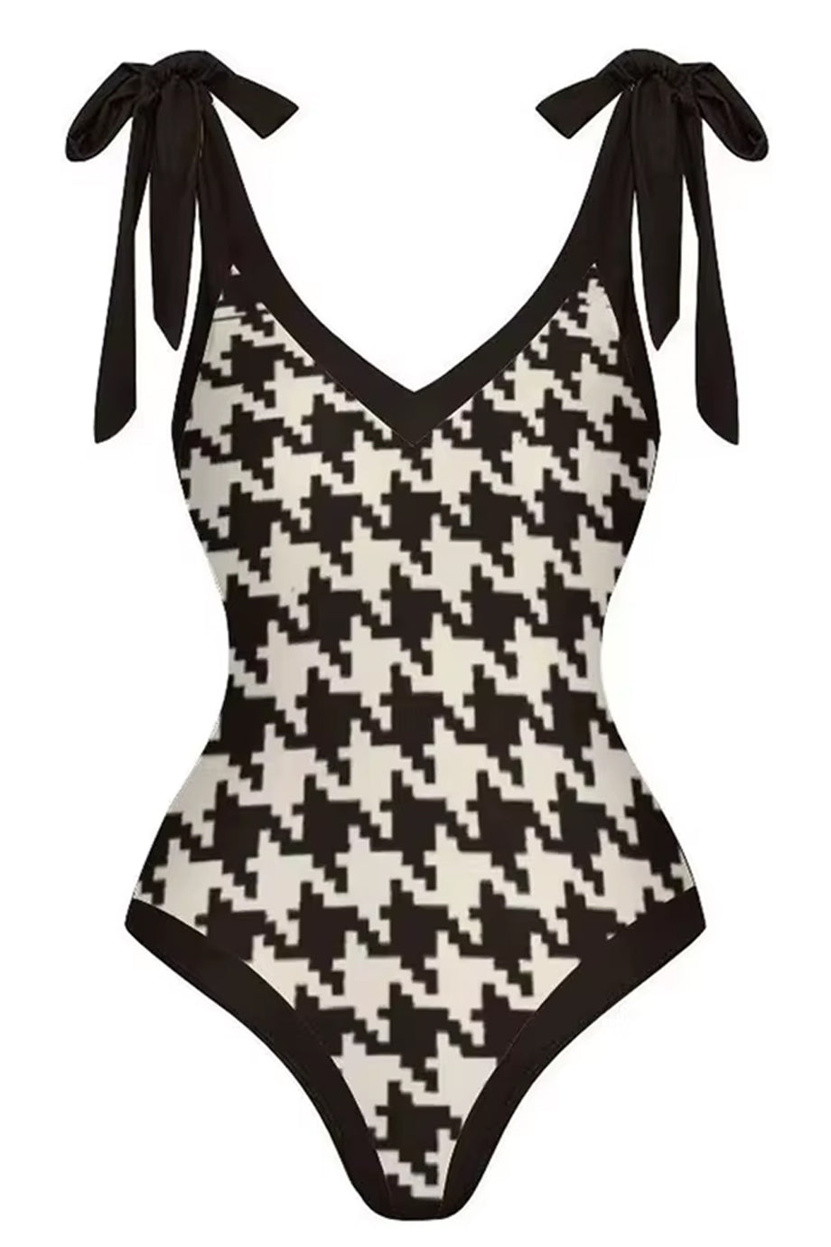 The Stella Marina swimsuit has a striking V-neck bodice and features a Houndstooth design with alternating black and white squares. It features wide straps that tie with a bow and an open back. Please refer to the size chart below for the correct size selection.
