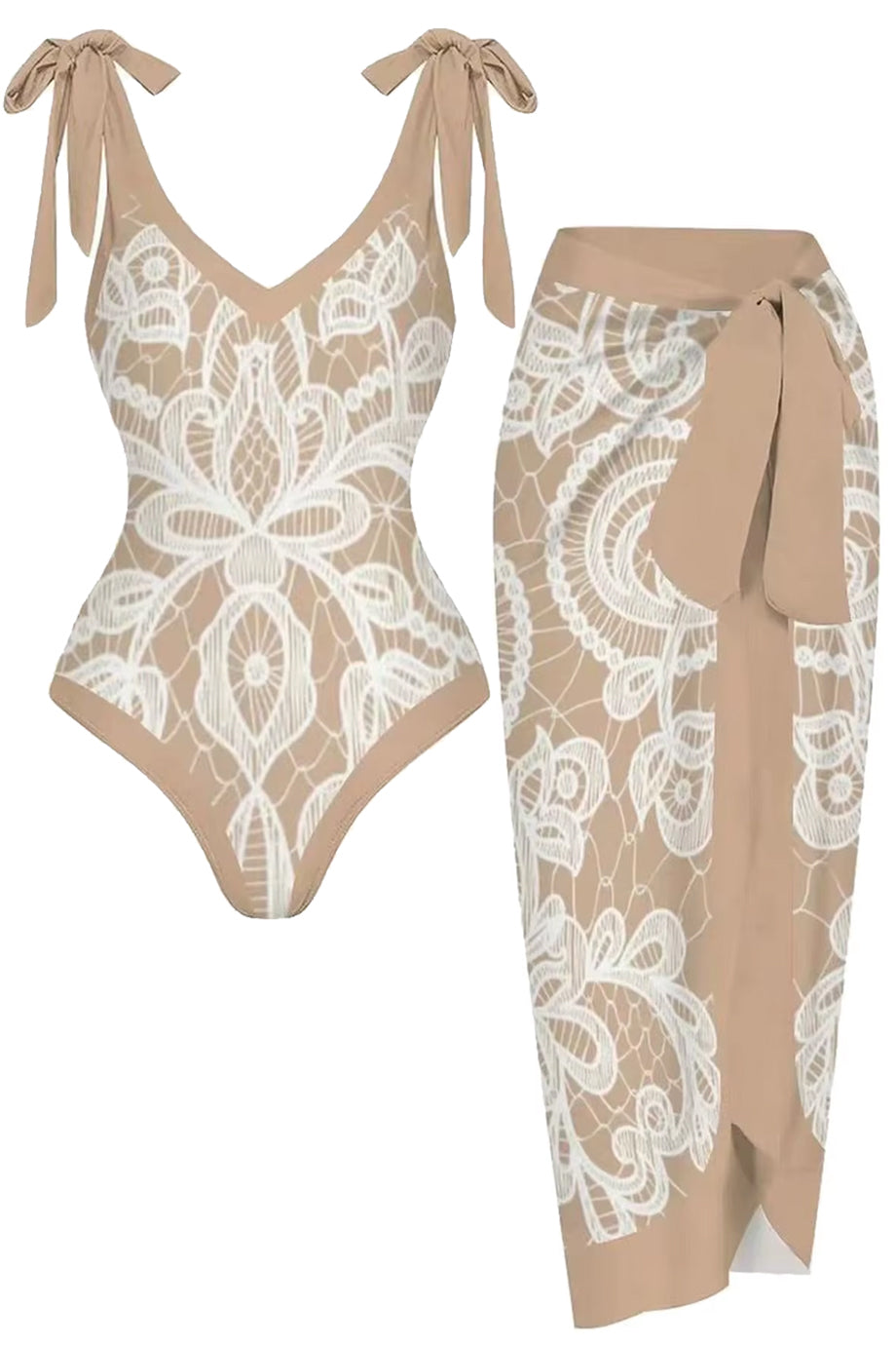 Delicately refined, Isalène pairs a nude base with intricate white lace motifs for a look that feels effortlessly elegant. The tied shoulder straps add a romantic touch, while the matching wrap skirt elevates the whole ensemble into timeless femininity. Comes with a padded bra for added support and comfort.
