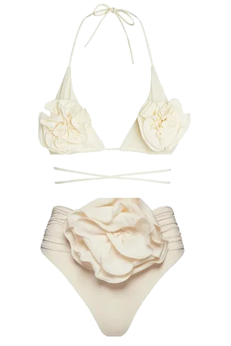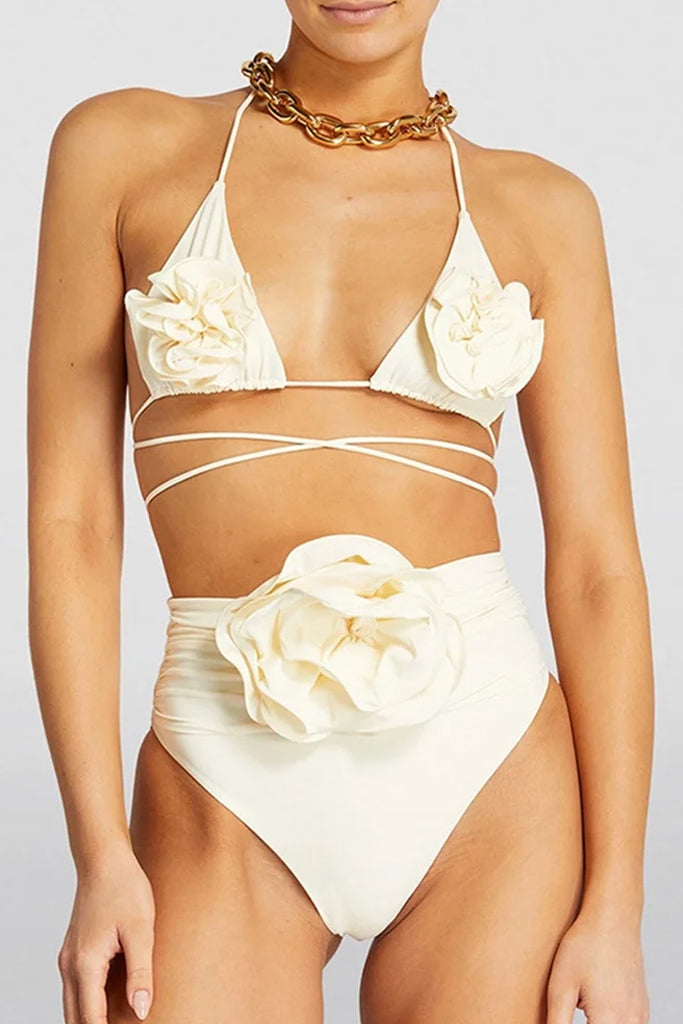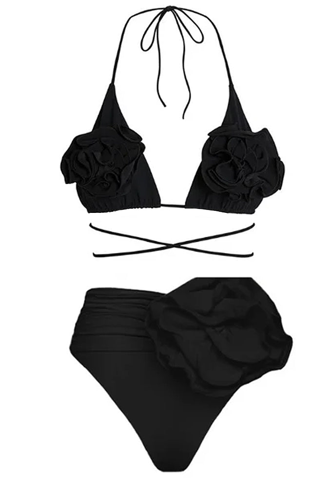 Bikini swimsuit with flower decoration. The Rosita swimsuit has a triangle top with long straps that tie criss-cross in the back and can also be criss-crossed around the tummy area. The bikini features a high-waist bottom decorated with a large flower at the side. Please consult the size chart below for the correct size selection.
