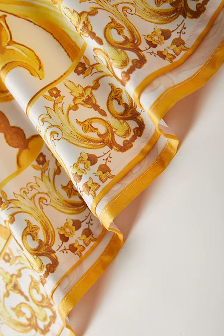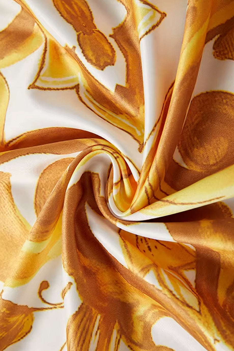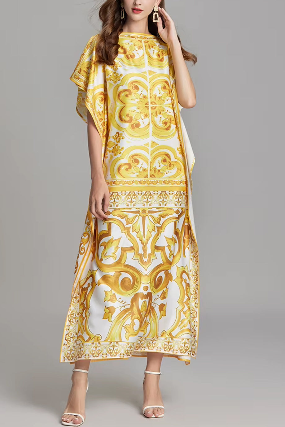 A unique, flowing kaftan dress from Philip Lang. The Yellow Reef dress features an elegant pattern in shades of gold and white. It has a loose, airy silhouette and short sleeves. Please refer to the size chart below for correct size selection.